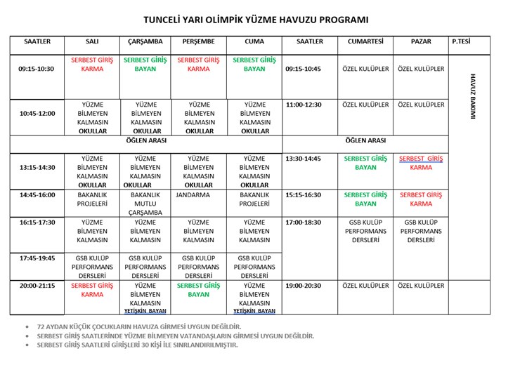 08.09.2025 TARİHİ İTİBARİ İLE TUNCELİ YARI OLİMPİK YÜZME HAVUZU SAATLERİ GÜNCELLENMİŞTİR.